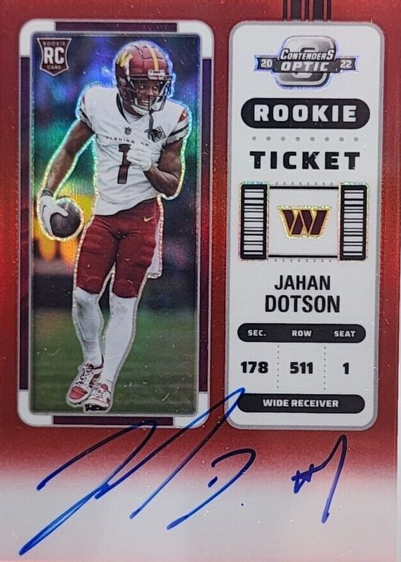 Best Prices Available For Sale of Jahan Dotson 2022 Contenders Optic #121 Rookie Ticket Auto - Red /149