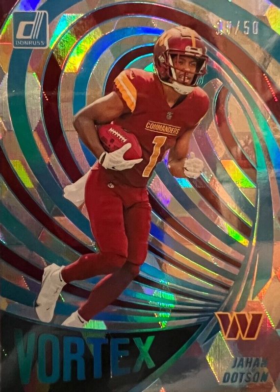 The Jahan Dotson 2022 Donruss #VTX-22 Vortex - Cubic /50 Rookie card in Raw condition has not changed in price in the last 30 days and was last sold for $8.00 .