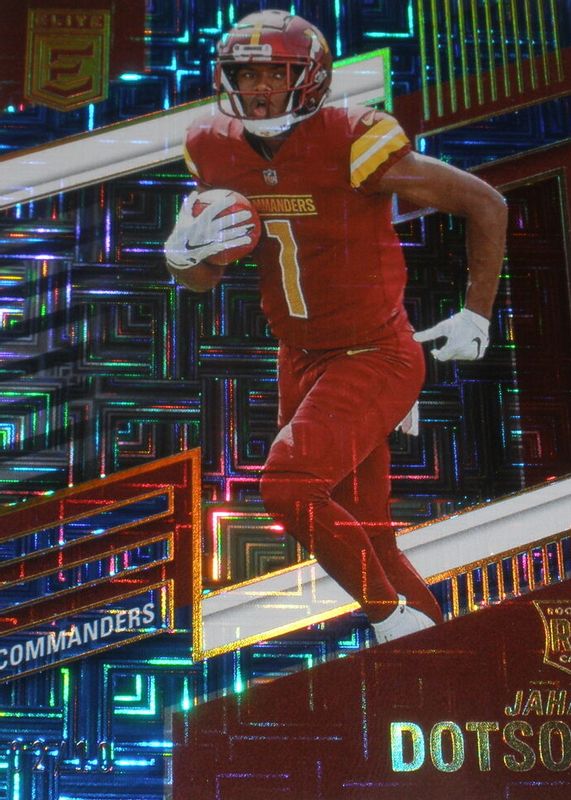 This card is 1 of 15 Jahan Dotson's card variations in the 2022 Elite set being tracked by Sports Card Investor, including Base Rookie /999, Aspirations (/99), Green, Pink, and Status (/1).
