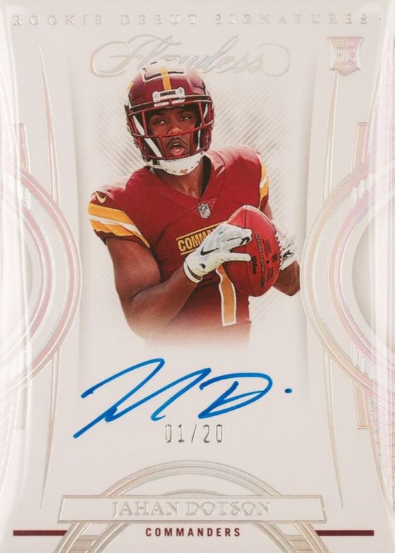 This card is 1 of 49 Jahan Dotson's card variations in the 2022 Flawless set being tracked by Sports Card Investor, including Rookie Debut Signatures (/25), Rookie Debut Signatures - Ruby (/15), Rookie Debut Signatures - Sapphire (/10), Rookie Frame Signatures (/20), and Rookie Frame Signatures - Ruby (/10).