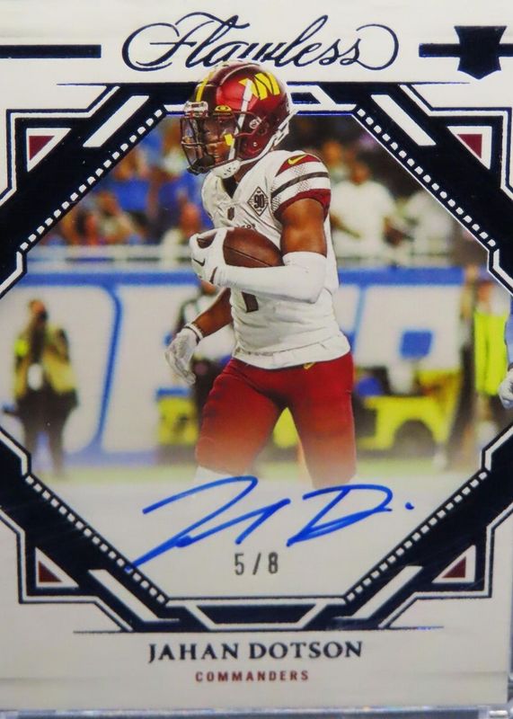 The Jahan Dotson 2022 Flawless #RFS-JD Rookie Frame Signatures - Sapphire (/8) card in Raw condition has not changed in price in the last 30 days and was last sold for $21.50 .