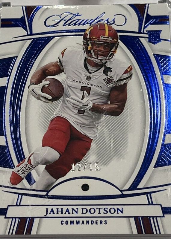 The Jahan Dotson 2022 Flawless #RGM-JD Rookie Gems Signatures - Sapphire /15 card in Raw condition has not changed in price in the last 30 days and was last sold for $32.00 .