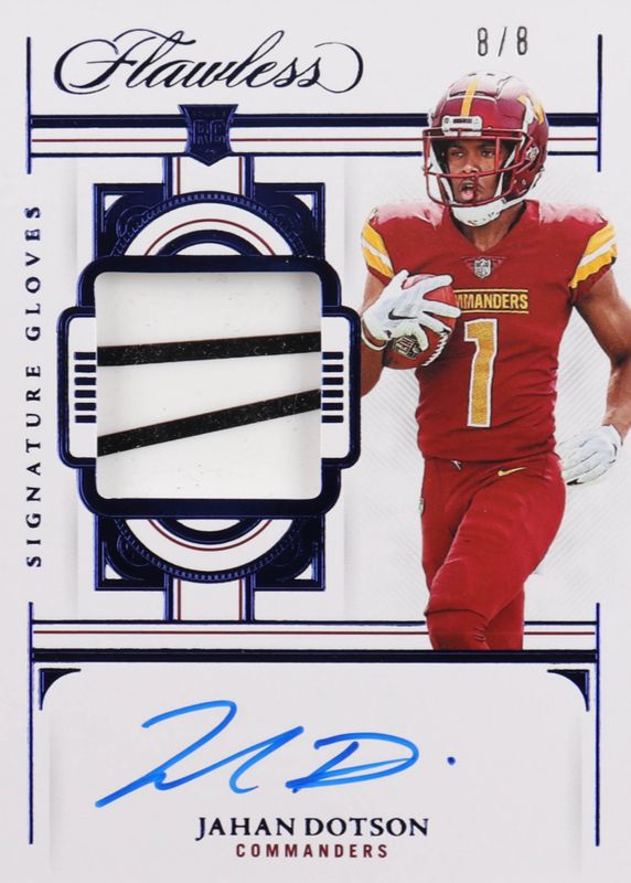 The Jahan Dotson 2022 Flawless #SG-JD Signature Gloves - Sapphire /8 Rookie card in Raw condition has not changed in price in the last 30 days and was last sold for $77.40 .