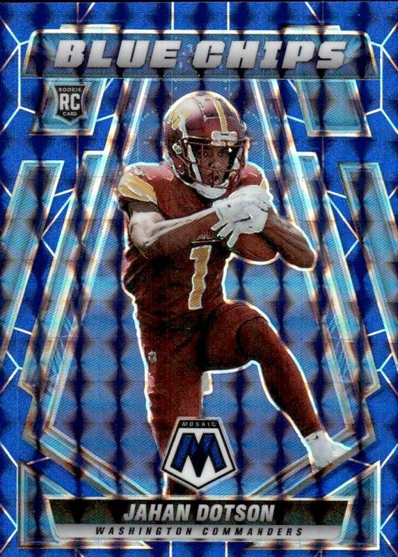 The Jahan Dotson 2022 Mosaic #BC-11 Blue Chips - Blue /99 Rookie card in Raw condition has not changed in price in the last 30 days and was last sold for $5.00 .