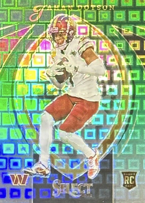 The Jahan Dotson 2022 Select #SCR-10 Select Certified Rookies - Green /5 card in Raw condition has not changed in price in the last 30 days and was last sold for $499.95 .