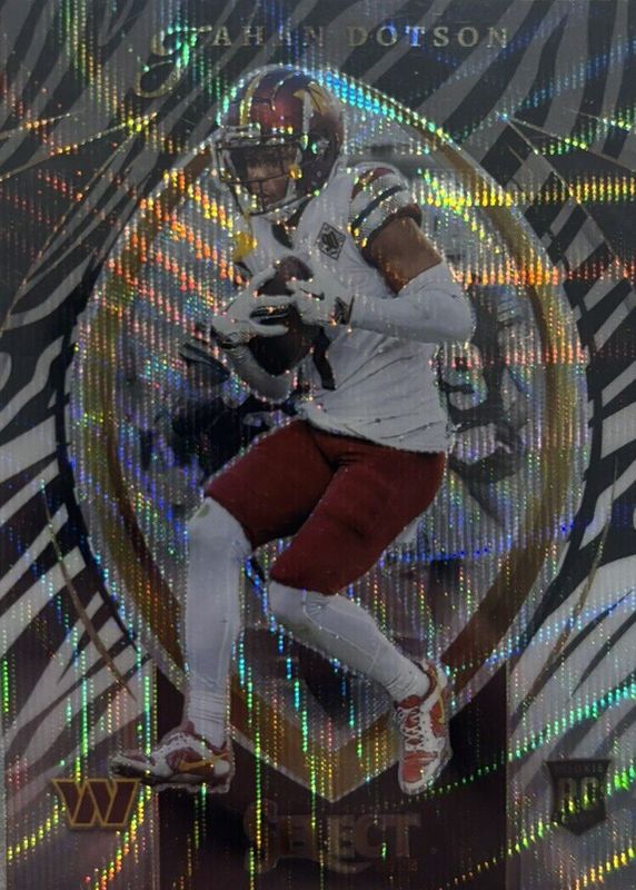 The Jahan Dotson 2022 Select #SCR-10 Select Certified Rookies - Zebra /(SSP) card in Raw condition has not changed in price in the last 30 days and was last sold for $13.00 .