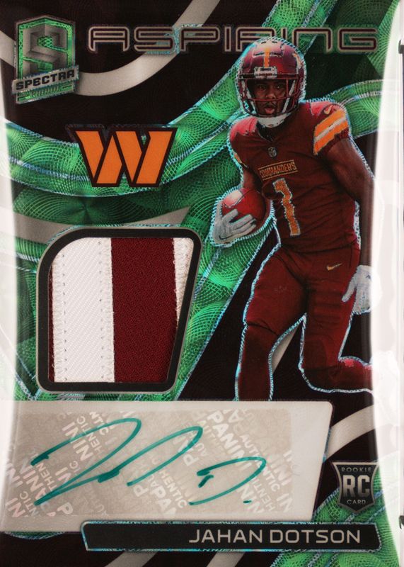 The Jahan Dotson 2022 Spectra #APA-JDO Aspiring Patch Autographs - Neon Green /35 Rookie card in Raw condition has not changed in price in the last 30 days and was last sold for $57.74 .