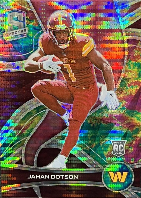 This card is 1 of 56 Jahan Dotson's card variations in the 2022 Spectra set being tracked by Sports Card Investor, including Base, Silver, Hyper /75, Interstellar /60, and Neon Blue Die-Cut /50.