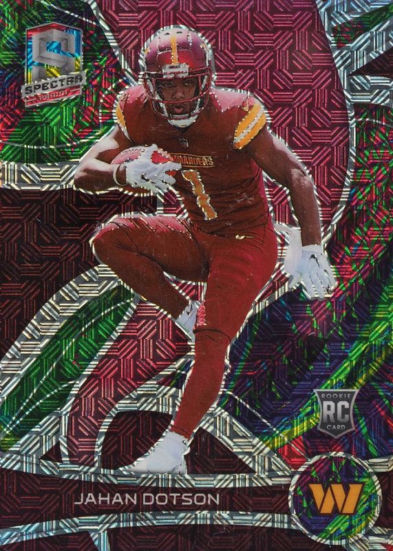 The Jahan Dotson 2022 Spectra #148 Meta /25 Rookie card in Raw condition has not changed in price in the last 30 days and was last sold for $5.50 .