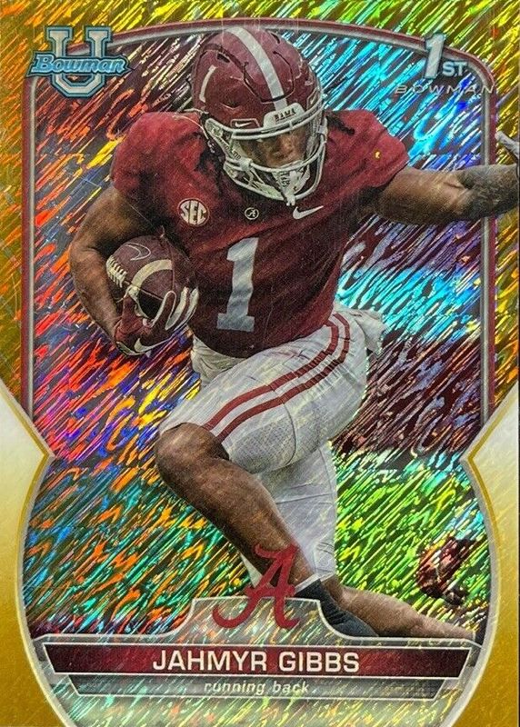 Jahmyr Gibbs 2022 Bowman Chrome University #82 Prospects - Gold Shimmer Refractor /50 (1st) PSA 9 Price Guide
