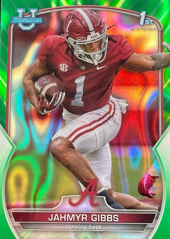 The Jahmyr Gibbs 2022 Bowman Chrome University #82 Prospects - Green Lava Refractor /99 (1st) card in Raw condition has not changed in price in the last 30 days and was last sold for $19.99 .