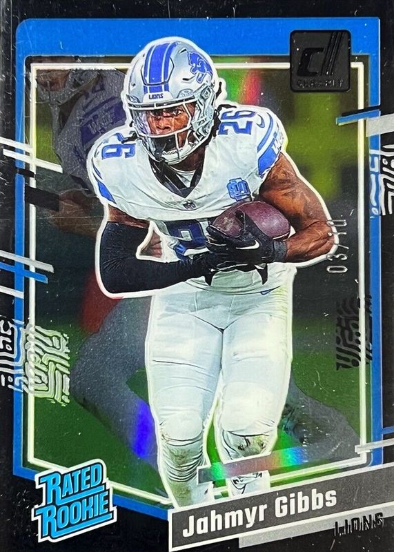 This card is 1 of 23 Jahmyr Gibbs' card variations in the 2023 Clearly Donruss set being tracked by Sports Card Investor, including Base, Gold, Holo Mosaic, Holo Rated Rookie Logo, and Purple /199.
