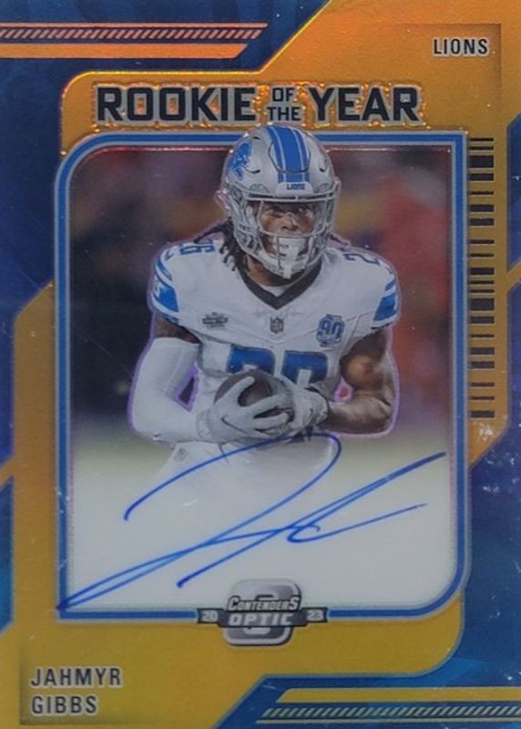 JAHMYR GIBBS 2023 CONTENDERS OPTIC ROOKIE OF THE YEAR GOLD RC AUTO 01/10 Q3873