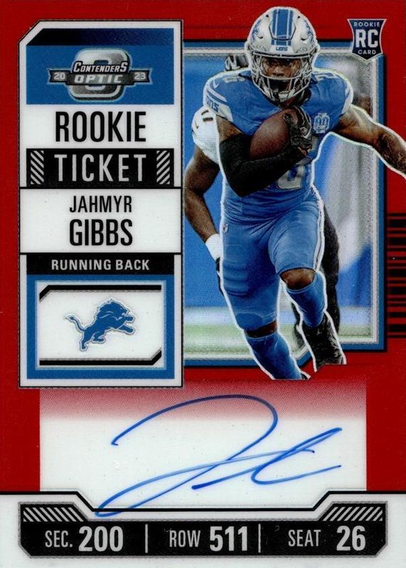 2023 Contenders Optic Jahmyr Gibbs RC Rookie Ticket Auto Red /125💥Lions Perfect