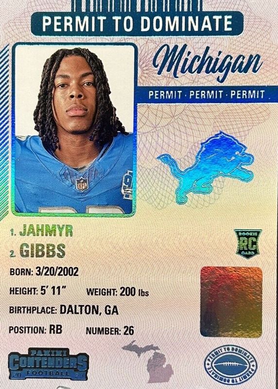 The Jahmyr Gibbs 2023 Contenders #13 Permit to Dominate /(SSP) Rookie card in Raw condition has moved down -$11.50 (-11.9%) in the last 30 days and was last sold for $85.00 .