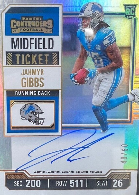 This card is 1 of 31 Jahmyr Gibbs' card variations in the 2023 Contenders set being tracked by Sports Card Investor, including Rookie Ticket Auto, Rookie Ticket Auto - Opening Kickoff Ticket, Rookie Ticket Auto - Red Zone Ticket, Rookie Ticket Auto - Ticket Stub (/28), and Rookie Ticket Auto Variation.