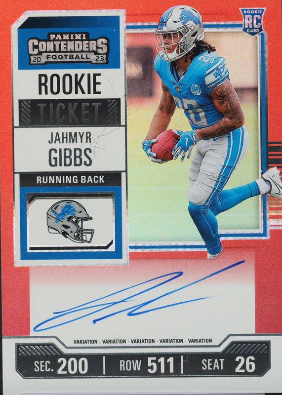 This card is 1 of 31 Jahmyr Gibbs' card variations in the 2023 Contenders set being tracked by Sports Card Investor, including Rookie Ticket Auto, Rookie Ticket Auto - Opening Kickoff Ticket, Rookie Ticket Auto - Red Zone Ticket, Rookie Ticket Auto - Ticket Stub (/28), and Rookie Ticket Auto Variation.