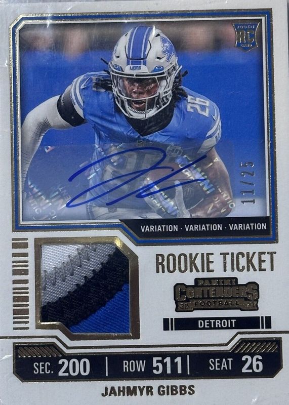 This card is 1 of 31 Jahmyr Gibbs' card variations in the 2023 Contenders set being tracked by Sports Card Investor, including Rookie Ticket Auto, Rookie Ticket Auto - Opening Kickoff Ticket, Rookie Ticket Auto - Red Zone Ticket, Rookie Ticket Auto - Ticket Stub (/28), and Rookie Ticket Auto Variation.