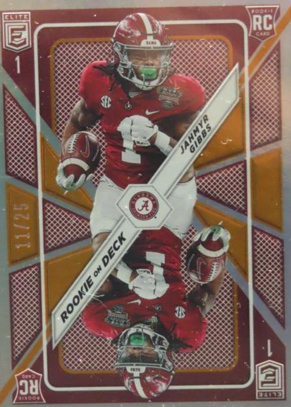 The Jahmyr Gibbs 2023 Elite #RD-10 Rookie on Deck - Orange /25 card in Raw condition has not changed in price in the last 30 days and was last sold for $15.50 .