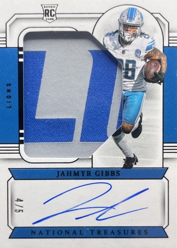 This card is 1 of 59 Jahmyr Gibbs' card variations in the 2023 National Treasures set being tracked by Sports Card Investor, including Rookie Material Signatures - Green Jersey Number (/26), Rookie Patch Auto - Green Jersey Number (/26), Crossover Rookie Patch Autographs /99, Rookie Material Signatures /99, and Rookie Patch Auto /99.