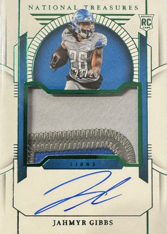 This card is 1 of 59 Jahmyr Gibbs' card variations in the 2023 National Treasures set being tracked by Sports Card Investor, including Rookie Material Signatures - Green Jersey Number (/26), Crossover Rookie Patch Autographs /99, Rookie Material Signatures /99, Rookie Patch Auto /99, and Rookie Signatures Field Pass /99.