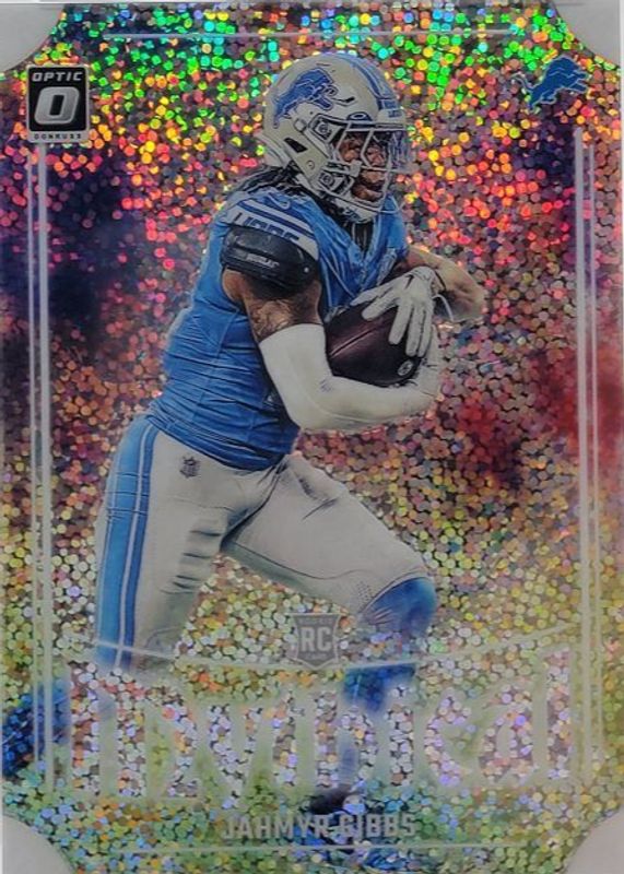 This card is 1 of 98 Jahmyr Gibbs' card variations in the 2023 Optic set being tracked by Sports Card Investor, including Base, Blue Hyper, Blue Scope, Green Hyper, and Green Velocity.