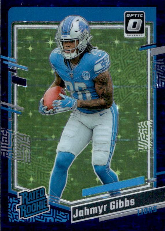 The Jahmyr Gibbs 2023 Optic #236 Purple Stars /15 Rookie card in Raw condition has not changed in price in the last 30 days and was last sold for $100.99 .