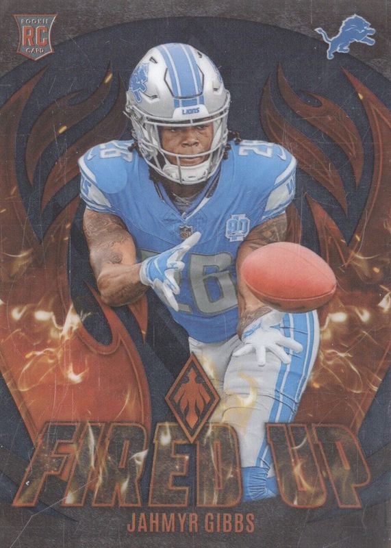 The Jahmyr Gibbs 2023 Phoenix #FU-10 Fired Up - Black /10 Rookie card in Raw condition has not changed in price in the last 30 days and was last sold for $26.00 .
