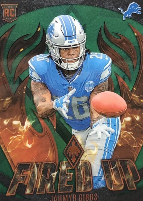 The Jahmyr Gibbs 2023 Phoenix #FU-10 Fired Up - Green /15 Rookie card in Raw condition has not changed in price in the last 30 days and was last sold for $40.00 .