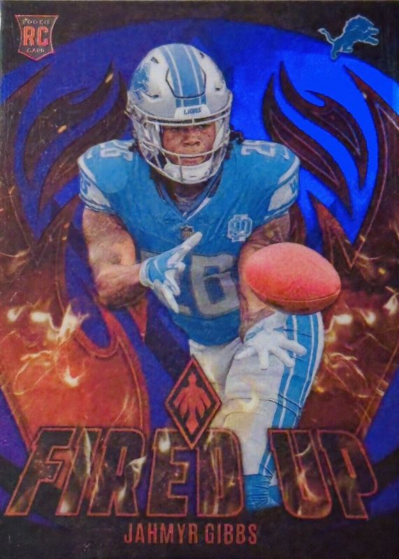 The Jahmyr Gibbs 2023 Phoenix #FU-10 Fired Up - Purple /99 Rookie card in Raw condition has moved up $5.00 (+25.0%) in the last 30 days and was last sold for $25.00 .
