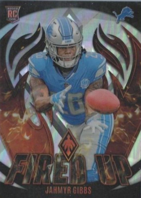 The Jahmyr Gibbs 2023 Phoenix #FU-10 Fired Up - Silver Rookie card in Raw condition has moved down -$1.74 (-34.9%) in the last 30 days and was last sold for $3.25 .
