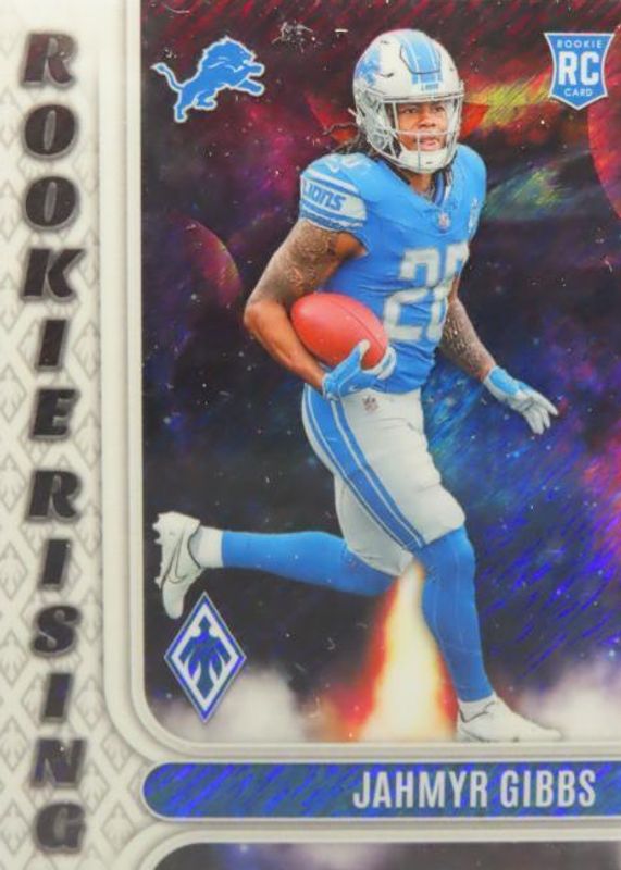 The Jahmyr Gibbs 2023 Phoenix #RIS-8 Rookie Rising - White Shimmer /(SSP) card in Raw condition has not changed in price in the last 30 days and was last sold for $21.50 .