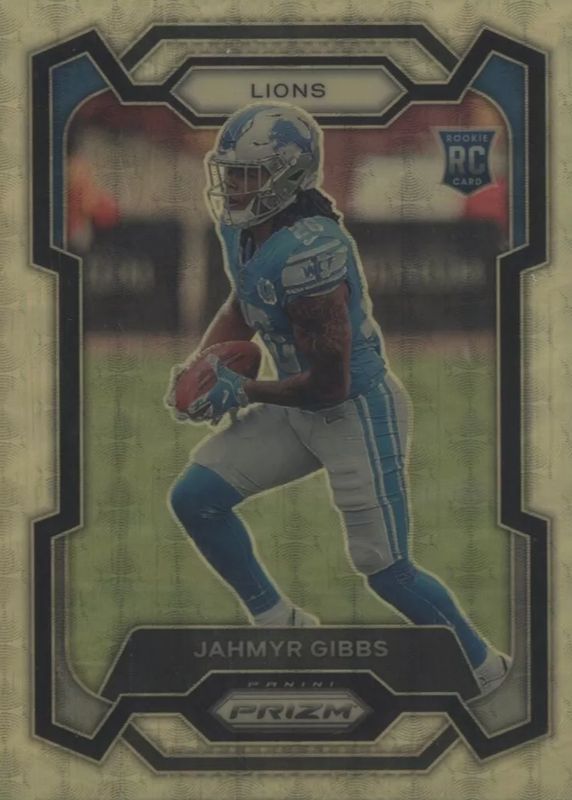 This card is 1 of 120 Jahmyr Gibbs' card variations in the 2023 Prizm set being tracked by Sports Card Investor, including Base, Disco, Green, Green Ice, and Green Wave.