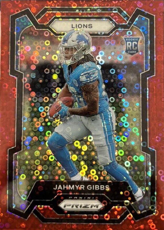 JAHMYR GIBBS 2023 PANINI PRIZM #331 ROOKIE NO HUDDLE RED RC 42/70 LIONS