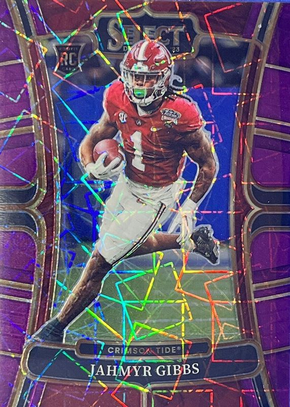 The Jahmyr Gibbs 2023 Select Draft Picks #10 Concourse Purple Lazer Rookie card in Raw condition has not changed in price in the last 30 days and was last sold for $5.50 .