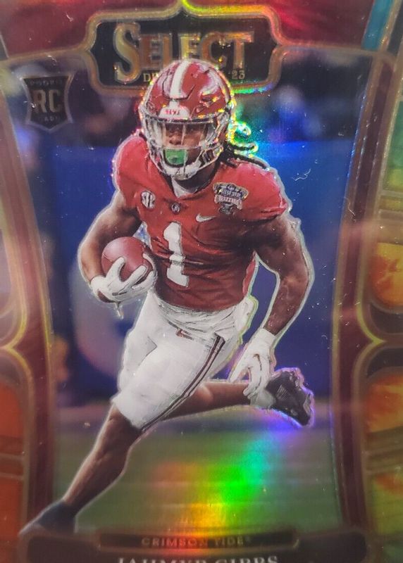 This card is 1 of 56 Jahmyr Gibbs' card variations in the 2023 Select Draft Picks set being tracked by Sports Card Investor, including Concourse, Field Level, Concourse Blue, Concourse Gold Lazer, and Concourse Green Lazer.