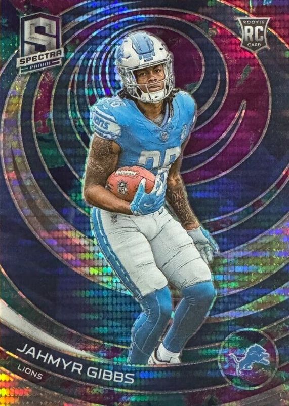 This card is 1 of 41 Jahmyr Gibbs' card variations in the 2023 Spectra set being tracked by Sports Card Investor, including Base, Silver, Hyper /75, Interstellar /60, and Neon Blue Die-Cut /50.