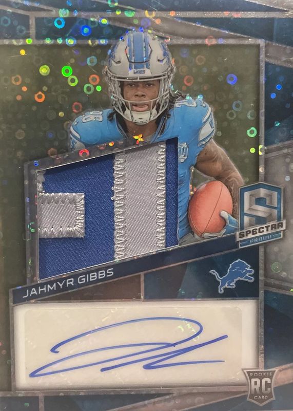 Jahmyr Gibbs 2023 Spectra #212 Rookie Patch Auto - Neon Blue /50 RAW Price Guide
