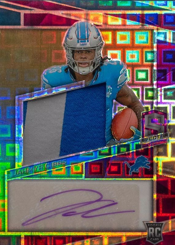 Jahmyr Gibbs 2023 Spectra #212 Rookie Patch Auto - Neon Purple /30 RAW Price Guide