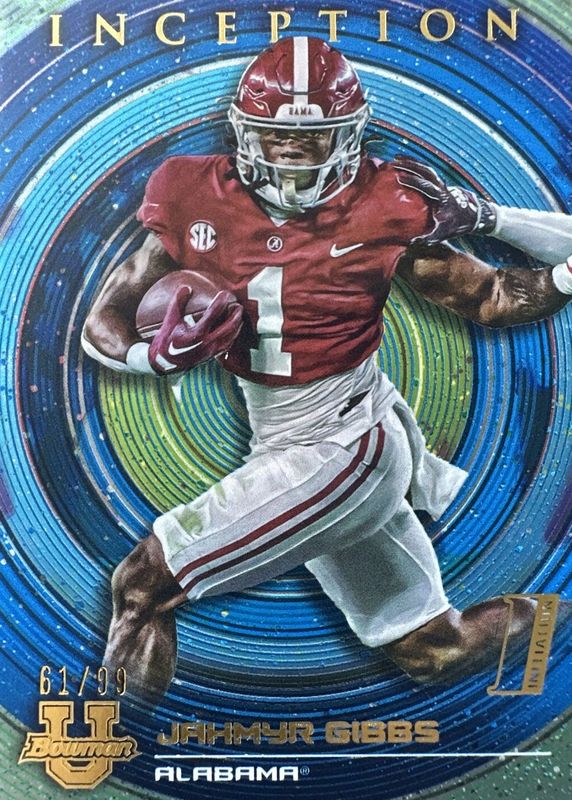 This card is 1 of 17 Jahmyr Gibbs' card variations in the 2022 Bowman University Inception set being tracked by Sports Card Investor, including Base (1st), Green Foil /299 (1st), Aqua Foil /199 (1st), Fuchsia Foil /75 (1st), and Gold Foil /50 (1st).