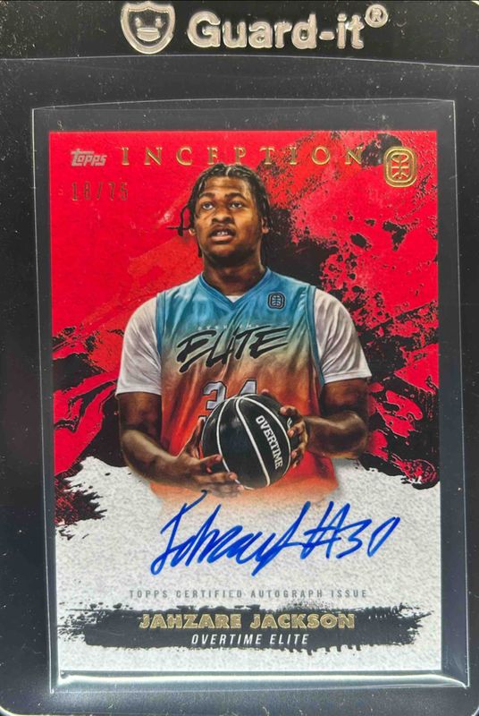 The Jahzare Jackson 2021 Topps Inception OTE Overtime Elite #IA-JJ2 Inception Autographs - Red /75 card is 1 of 103 Jahzare Jackson's card variations in the 2021 Topps Inception OTE Overtime Elite set being tracked by Sports Card Investor, including #3 Base, #32 Base, #46 Base, #9 Base, and #46 Blue /199.