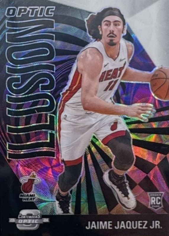 The Jaime Jaquez Jr. 2023 Contenders Optic #24 Optic Illusion - International Black & White /25 Rookie card in Raw condition has not changed in price in the last 30 days and was last sold for $20.00 .