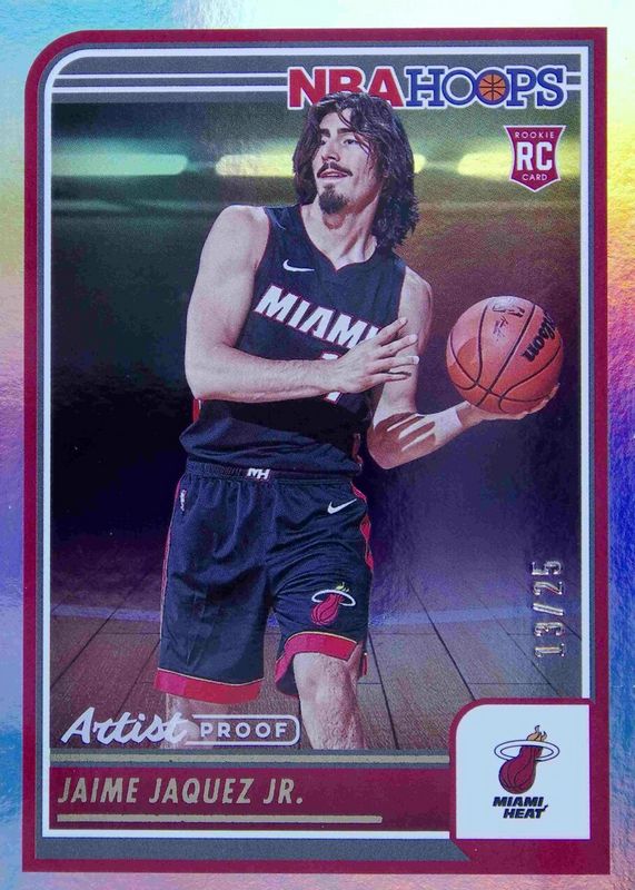The Jaime Jaquez Jr. 2023 Hoops #249 Artist Proof /25 Rookie card in Raw condition has not changed in price in the last 30 days and was last sold for $21.75 .