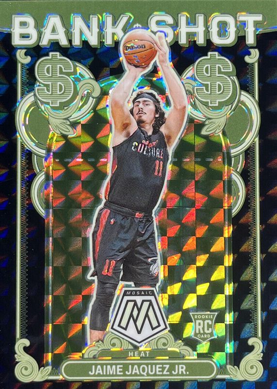 The Jaime Jaquez Jr. 2023 Mosaic #11 Bank Shot - Black /1 Rookie card in Raw condition has not changed in price in the last 30 days and was last sold for $504.00 .