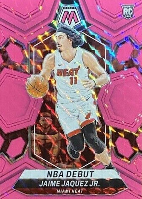 The Jaime Jaquez Jr. 2023 Mosaic #267 NBA Debut - Pink Fluorescent /10 Rookie card in Raw condition has not changed in price in the last 30 days and was last sold for $35.00 .
