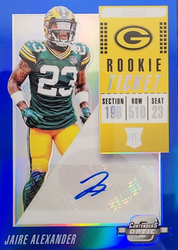 The Jaire Alexander 2018 Contenders Optic #150 Rookie Ticket Auto - Blue (/25) card in Raw condition has not changed in price in the last 30 days and was last sold for $52.00 .