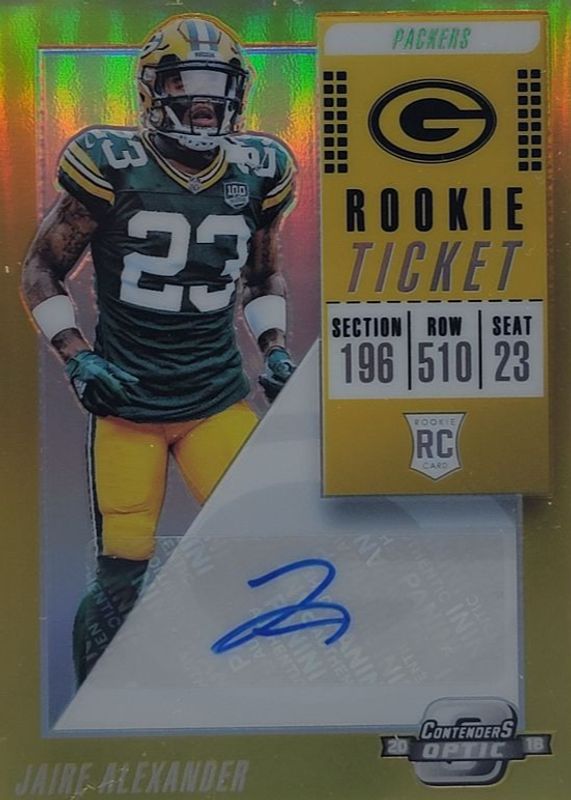 The Jaire Alexander 2018 Contenders Optic #150 Rookie Ticket Auto - Gold /10 card in Raw condition has not changed in price in the last 30 days and was last sold for $190.50 .