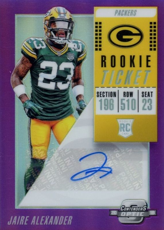 The Jaire Alexander 2018 Contenders Optic #150 Rookie Ticket Auto - Purple (/99) card in Raw condition has not changed in price in the last 30 days and was last sold for $28.00 .