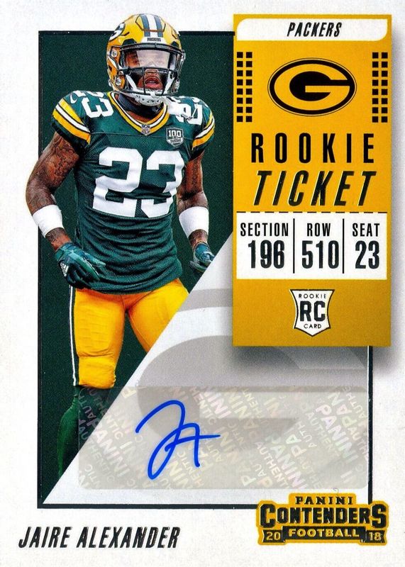 The Jaire Alexander 2018 Contenders #153 Rookie Ticket Auto card in Raw condition has moved up $7.00 (+53.8%) in the last 30 days and was last sold for $20.00 .
