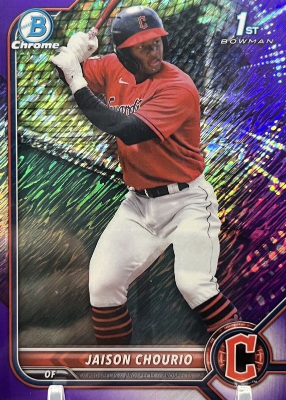 Auctions Ending Soon for Jaison Chourio 2022 Bowman Chrome #BCP-174 Prospects - Purple Shimmer Refractor /250 (1st) RAW